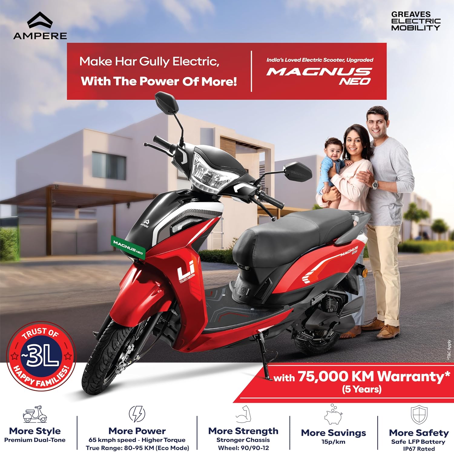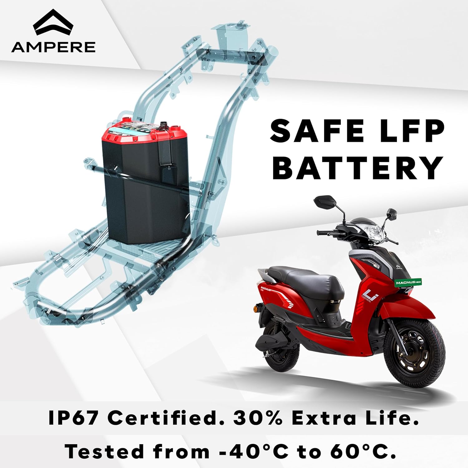Performance: Certified Range Per Charge | Top Speed |Acceleration |Motor Power: Performance: 80-95 km per charge | Top Speed 65 kmph | Acceleration 6.5 Sec (0-40km/h) | Motor Power (Nominal |Peak): 1.5 kW | 2.4 kW Battery: 1 Battery | Capacity 2.3 kwh | Charger Time: 5-6 hrs | Hub Motor | Ip67 Rated Design: LED Light | Tire Size - Front: 3.00-10, Rear: 3.00-10 | Alloy Wheel | Brake Front Brake: Drum Brake Rear Brake: Drum Brake CBS (Combined Braking System): Available | suspension - (Front) Telescopic Fork, (Rear) Coil spring with twin shock absorbers Dimension: Vehicle Length 1915 mm| Saddle Height 770mm | Ground Clearance 165 mm| Wheelbase 1390 mm| Kerb Weight 108 kg Smart Features: LCD instrument console, Bluetooth Connectivity: Optional smart connectivity is available, allowing riders to connect their smartphones to the scooter for additional functionalities. Riding Mode: The scooter offers three riding modes, including a reverse mode for easy manoeuvring