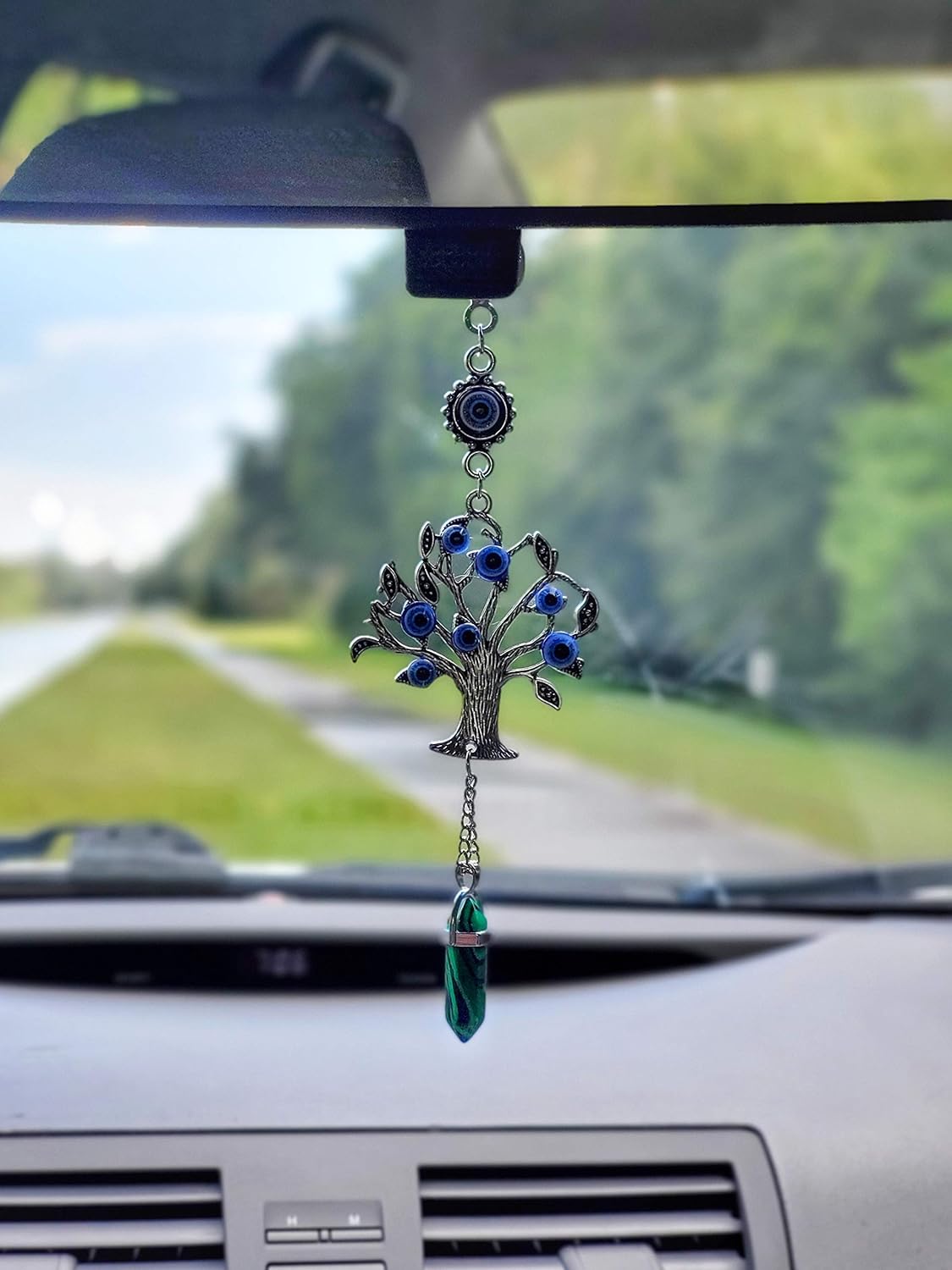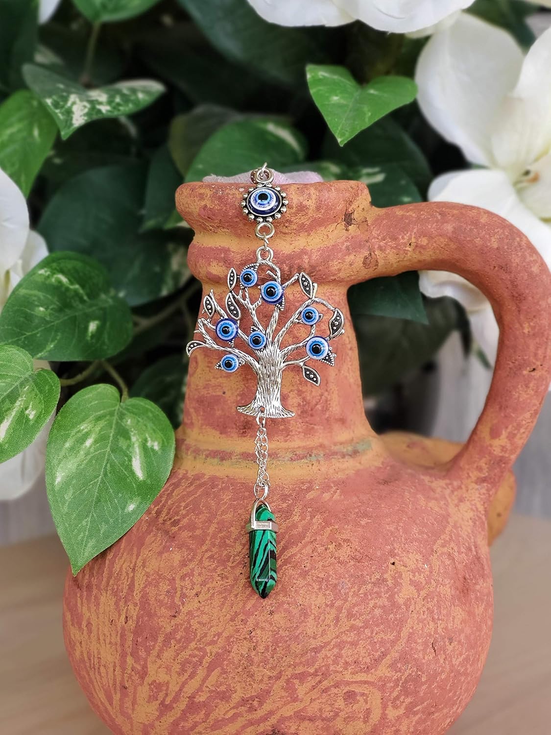 About this item FUNCTION: This beautiful ornate silver tree of life amulet is inlaid with blue evil eyes and adorned with malachite gemstone. A stylish decorative, the blue evil eye is used for prosperity, luck and security, while the hanging gemstone provides eminent future, growth, strength and protection. GEMSTONE POWER: The addition of gemstones helps make the evil eye decor into a eye protection and miracle ornament. Hang it on the bag, the car mirror or in any room/interior. Malachite is a green gemstone representing new life, spring, nature, energy, rebirth, growth, fertility and the natural environment.