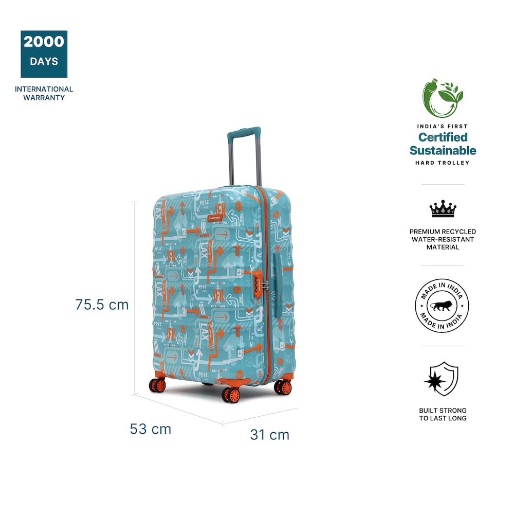 Textured Scratch resistant Polycarbonate shell This light weight trolley luggage comes with a Fixed combination Lock, 8 wheels with smooth manoeuvrability, and contrast beading that gives a premium look to the product Dimensions - 66X46X27 Color - Graphite Blue Meets most domestic check-in size requirements