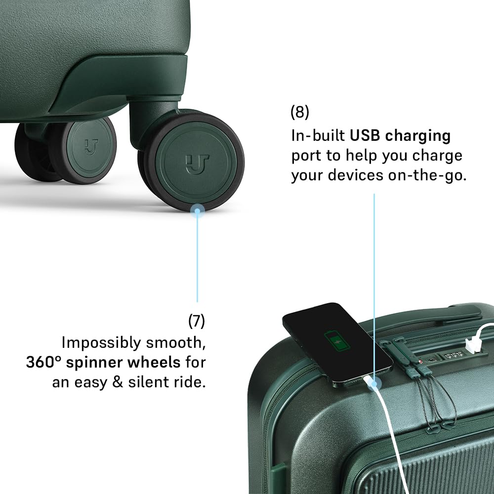 Unbreakable Polycarbonate Shell: Crafted from durable and unbrakable polycarbonate, ensuring superior protection and resilience during travel. Super Silent StealthTech Wheels: Glide through the airport in ninja modeβthese wheels are so quiet, you might forget you're rolling a suitcase. Smart Tech Features: Dual USB Charging Port β Stay powered on the go with two dedicated ports: USB-C for forward charging (charge your devices directly) and USB-A for reverse charging (charge your suitcaseβs built-in power bank or other gear). Dedicated Front-Opening Laptop Compartment β Securely fits laptops up to 15.6 inches and includes multiple organizer pockets for chargers, cables, documents, and travel essentials, ensuring quick access during airport security checks.