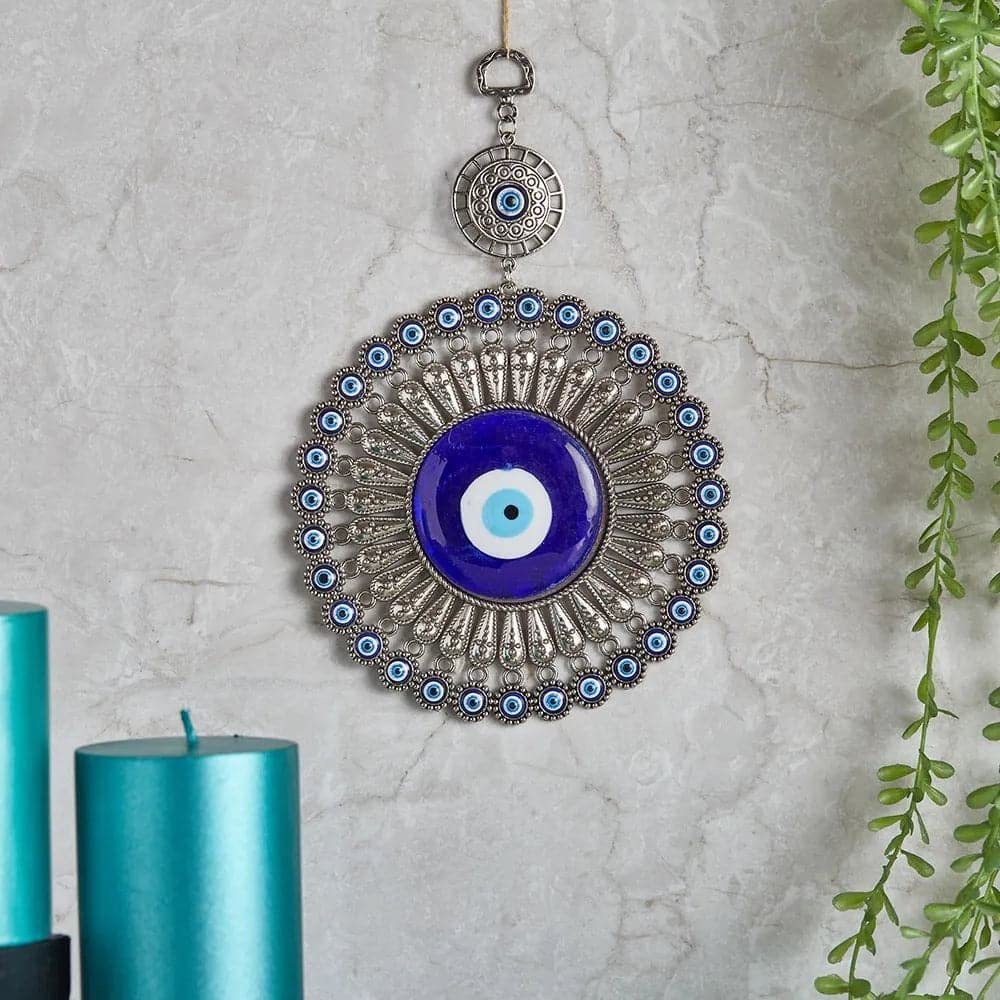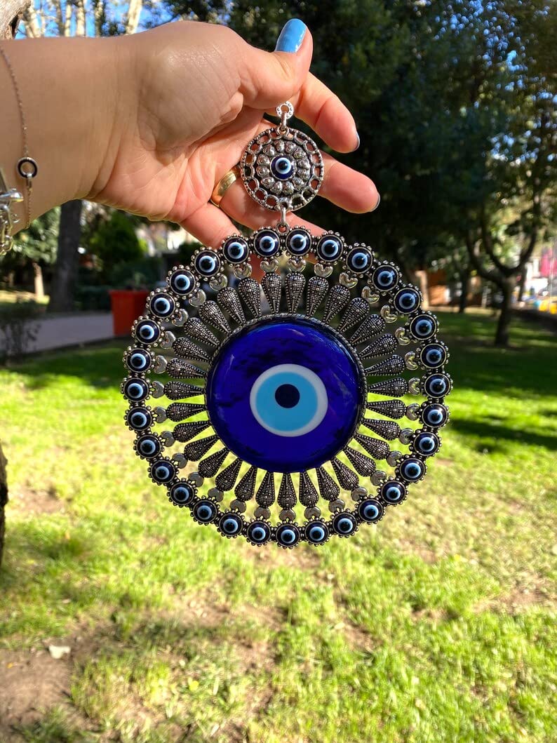 About this item Authentic Turkish Design: This wall hanging features a traditional blue glass evil eye, symbolizing protection and good fortune, handcrafted by skilled artisans. Premium Quality Materials: Made from durable blue glass, ensuring longevity and a vibrant appearance that catches the eye. Versatile Home Decor: Perfect for living rooms, bedrooms, offices, or as a thoughtful gift for housewarmings, birthdays, or spiritual celebrations. Easy Installation: Comes with a built-in hook for effortless hanging on walls, doors, or windows, integrating seamlessly into any space. Cultural Significance: The evil eye, or Nazar, is a renowned symbol in various cultures, believed to ward off negative energies and invite positivity.