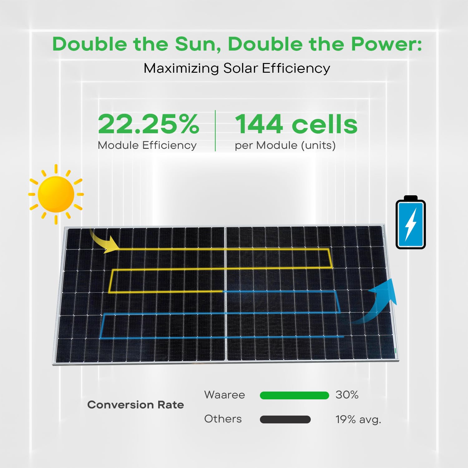 Dual-Sided Power Generation: Bifacial design allows sunlight absorption from both the front and rear surfaces, significantly increasing total energy output, especially when installed over reflective surfaces like concrete or white rooftops.Advanced TOPCon Cell Technology: Built with N-type TOPCon (Tunnel Oxide Passivated Contact) cells, delivering higher efficiency, better temperature performance, and lower degradation compared to conventional mono PERC panels.